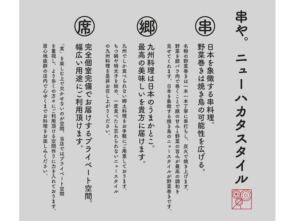 1F 2F 3F 4F 5F B1F 炭火ノ串や。ニューハカタスタイル 個室居酒屋 B1F ITEM野菜巻き 串料理 TEL026-266-0727 OPEN16:00〜24:00 FLOOR GUIDE トップに戻る